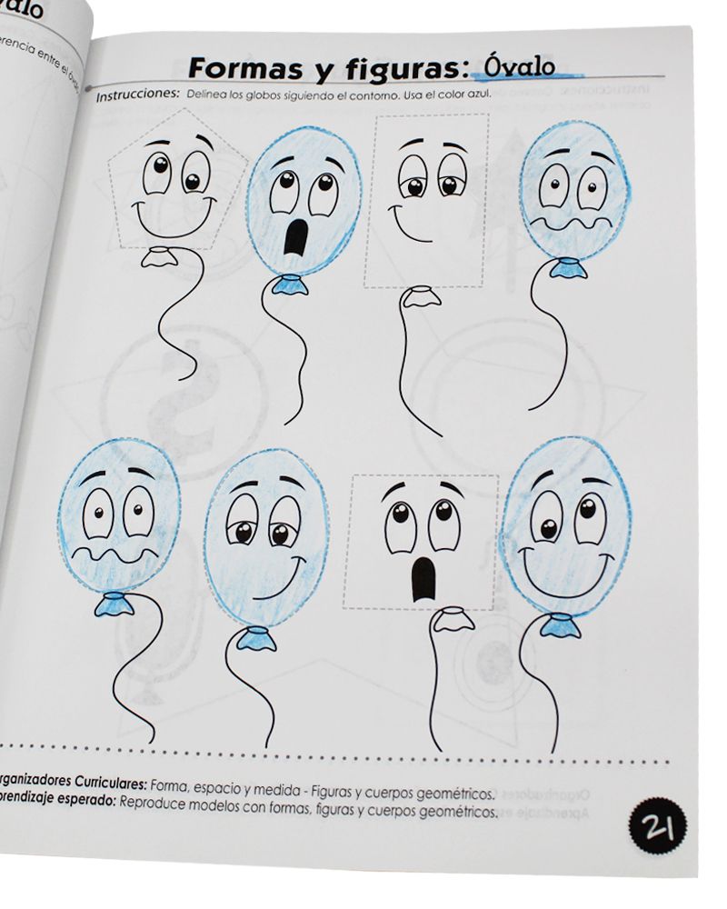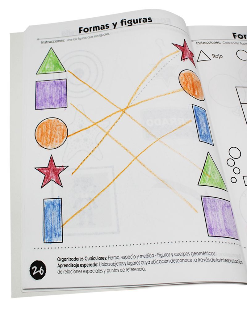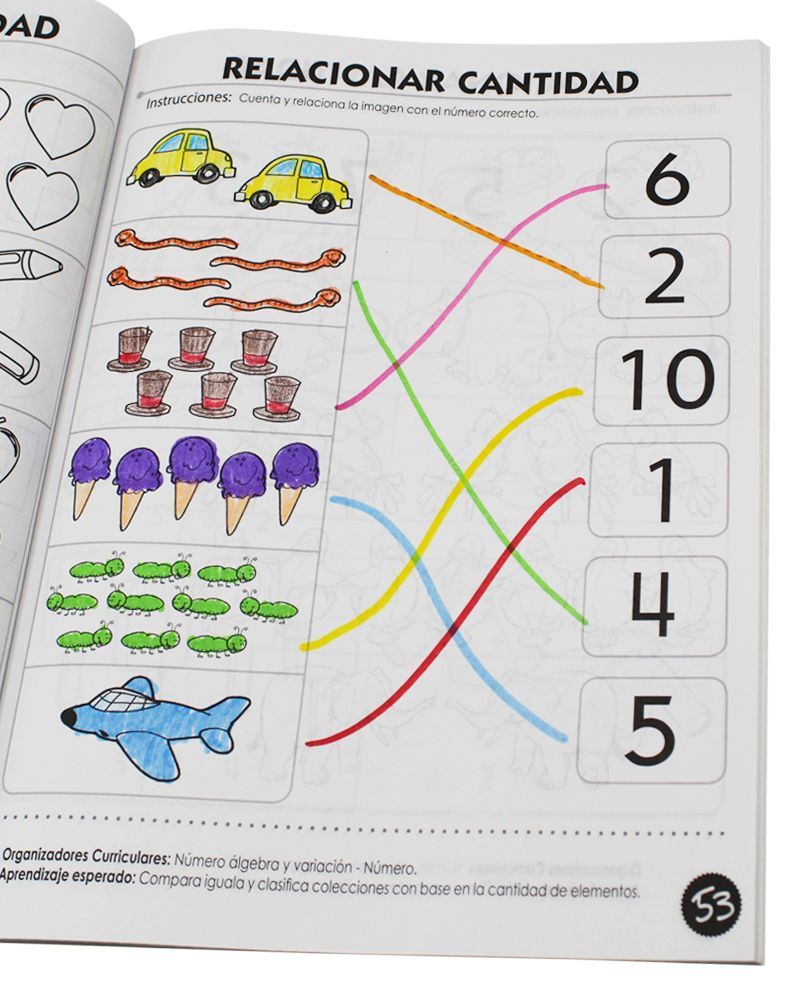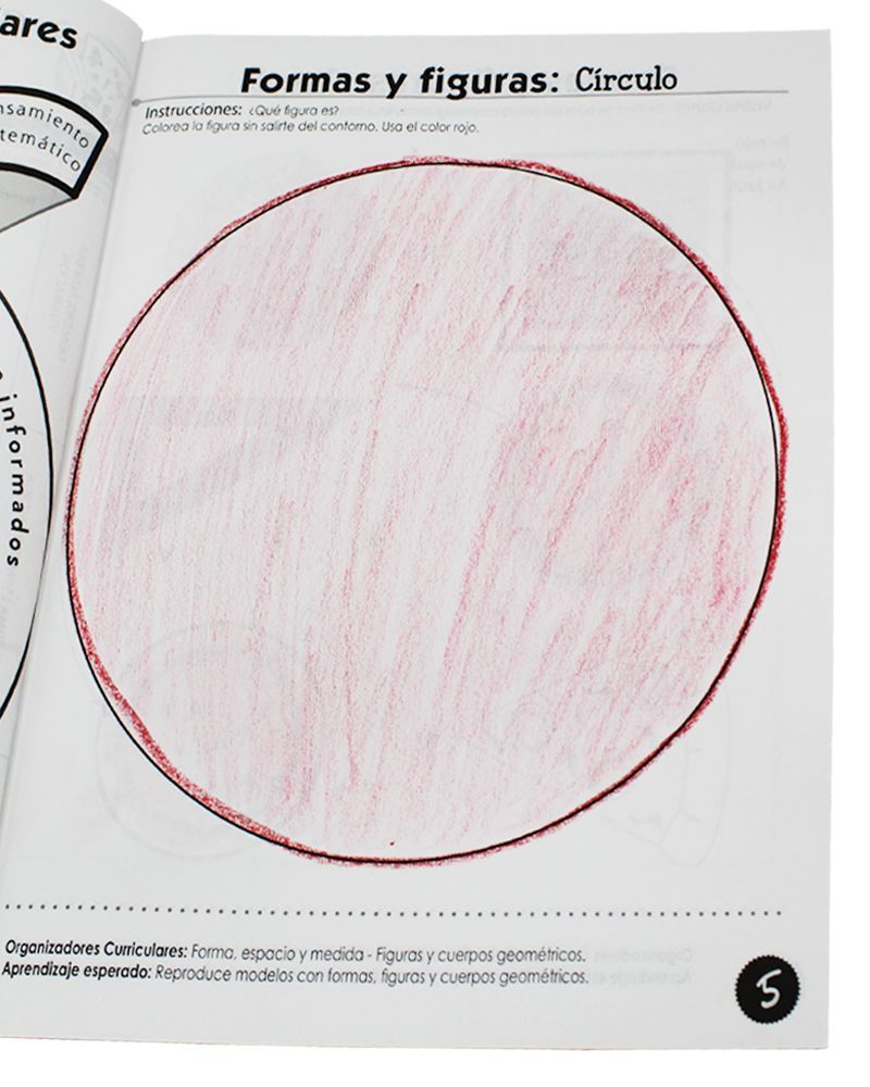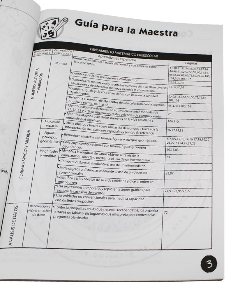 Libro Actividades Matemáticas para el aprendizaje del campo formativo Pensamiento Matemático en los aspectos de Número y Espacio Forma y Medida. Desarrolla el razonamiento lógico matemático. Además, incluye situaciones en las que los niños deben agregar, reunir, quitar, igualar, e identificar secuencias y repeticiones.